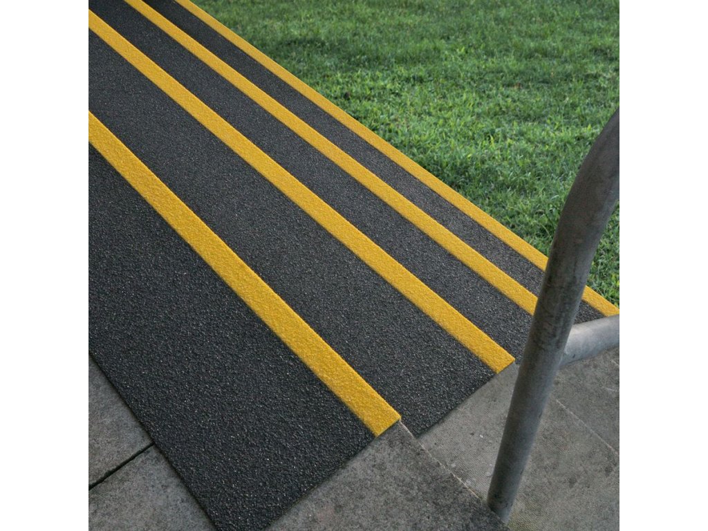 Schodová hrana vyrobená z odolného karbidu křemíku vytvářející trvalý protiskluzový povrch. Tento typ hrany je navržen pro celoplošné pokrytí schodu. Ohyb schodové hrany má kontrastní barvu dle bezpečnostních předpisů o rozměru 55 x 55 mm.