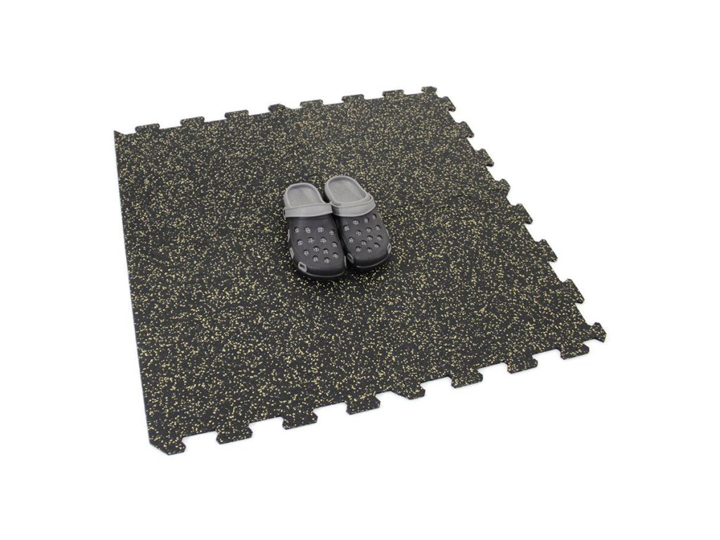 Gumová dlažba (modulová podlaha) FLOMA FitFlo SF1050 s příměsí 10% EPDM barevného granulátu v provedení 10% žlutá je ideální podlahou do domácích posiloven a fitness (profesionální fitness centra obvykle volí výšku 1,6 cm). Velice dobře absorbuje nárazy, pády při cvičení, zmírňují dopady činek a cvičícího nářadí. Nespornou výhodou materiálu je také šetrnost ke kloubnímu aparátu cvičence. Tato gumová podlahovina se dá použít jako celoplošná podlaha do domacích fitness, jako pochůzné plochy v posilovnách, jako podložky pod cvičící stroje, odkládací plochy pro činky a další.