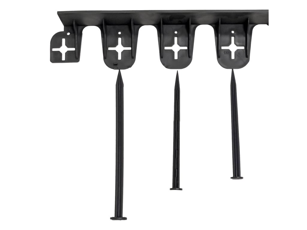 Pro fixaci obrubníku je potřeba dokoupit kotvící hřeby. Pro měkké podloží postačí plastové kotvící hřeby, pro pevnější (jílovité) podloží volte kovové hřeby. Plastový obrubník se kotví k zemi pomocí 9 ks kotvících kolíků na 80 cm. Po ukotvení se dosype plastový obrubník zeminou do požadované výšky.