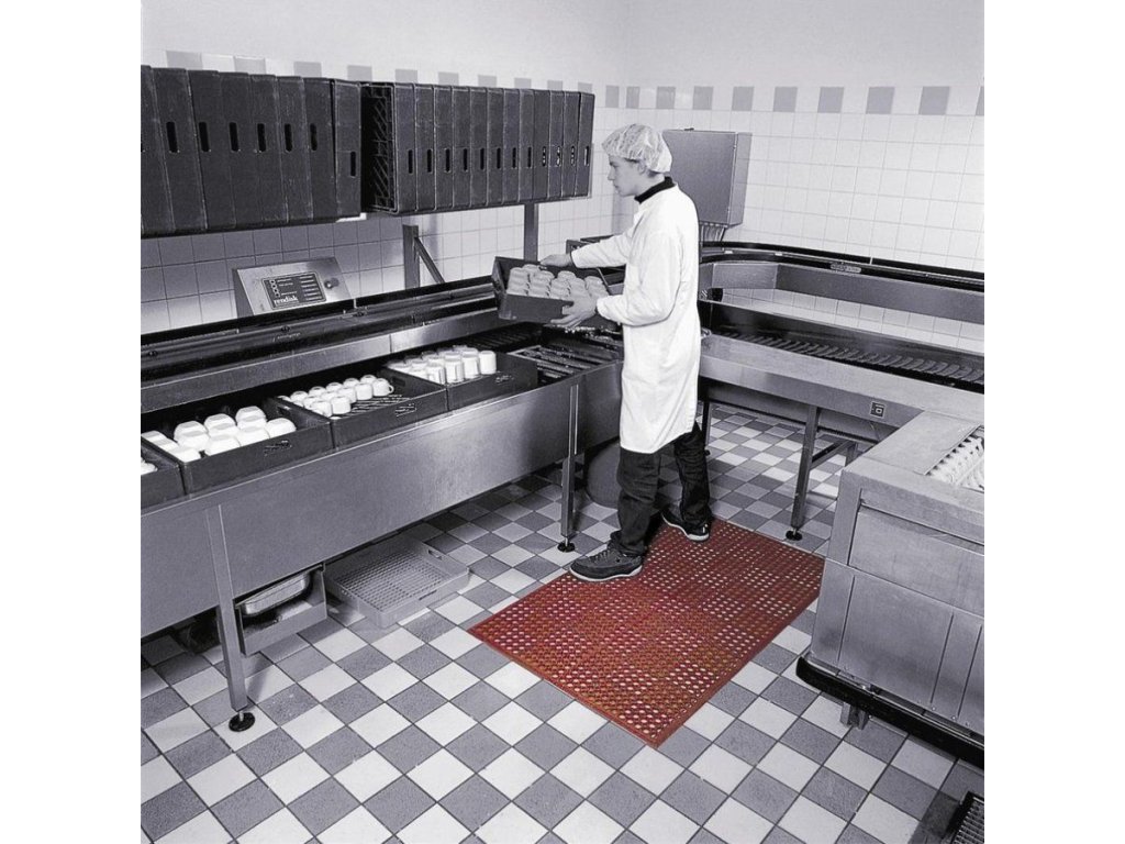 Červená gumová protiskluzová kuchyňská rohož Sanitop Red je rohož do mokrého prostředí. Drenážní otvory umožňují odvětrávání, protékání tekutin a propadávání nečistot, povrch tak zůstává suchý a čistý. Pravidelné čištění saponátem a tlakovou vodou prodlužuje jejich životnost. Neobsahují silikon, jsou vhodné i do lakoven. Rohože nabízejí ergonomický přínos ze stání na 12,7 mm vysoké podložce.