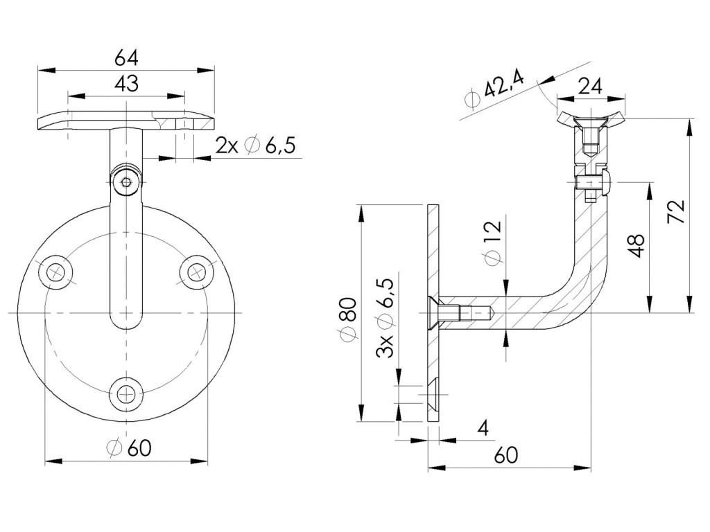 Držák madla na zeď. Kotvení držáku na zeď pomocí tří otvorů na přírubě - montážní spoj. Nastavitelný sklon madla.