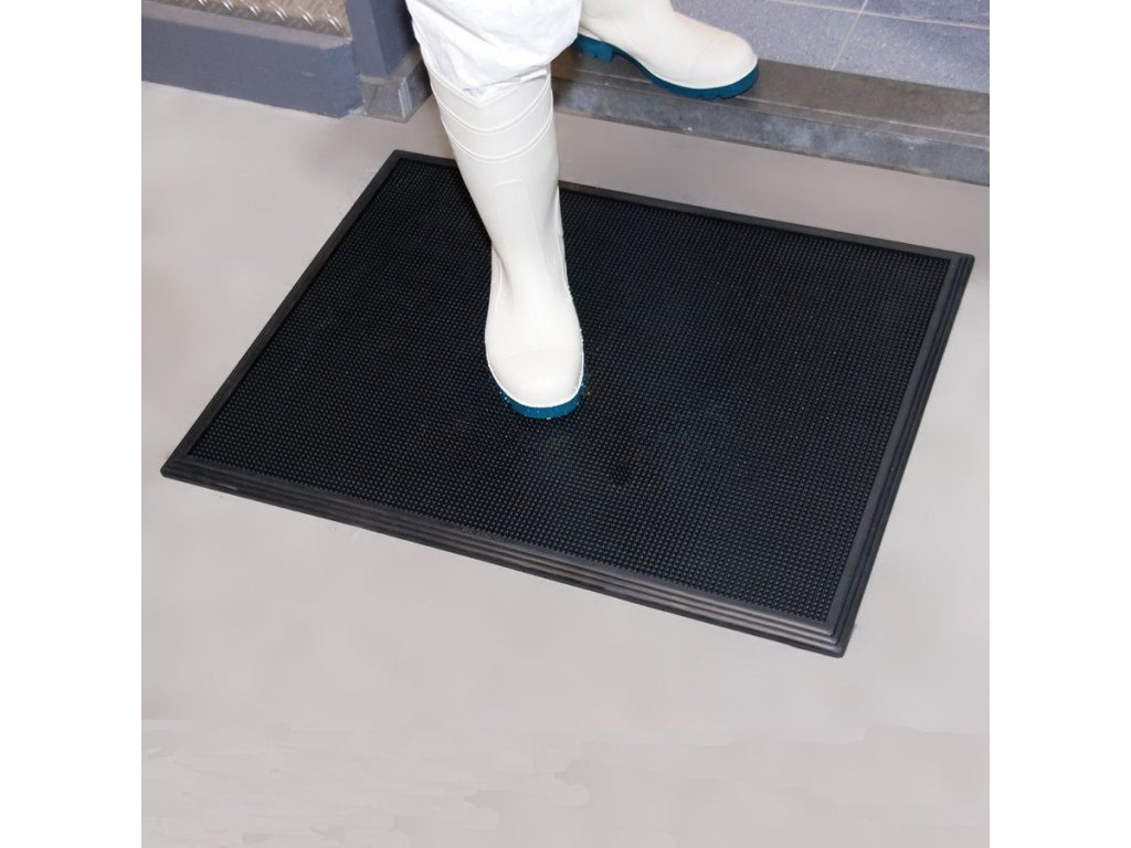 Černá gumová dezinfekční hygienická rohož Sani-Trax čistí a dezinfikuje podrážky obuvi. Neměla by chybět ve vchodu žádného provozu pracujícího s potravinami. Tisíce pružných gumových prstíků odstraní nečistoty z každého záhybu podrážky. Pod tlakem se ohnou a zachycené nečistoty uloží pod hladinu dezinfekčního roztoku. Tímto dvojím způsobem brání vnášení kontaminantů do potravinářských provozů. Rozměr rohože je vyhovující pro většinu vchodů. Přísavky na rubu rohože brání jejímu posouvání.