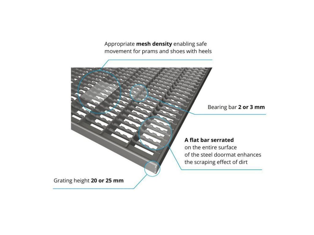 Kovová venkovní čistící vstupní rohož s ALU rámem FLOMA SteelMat je tvořena tlakem do sebe vlisovanými nosnými a rozpěrnými vroubkovanými pásky. Tím je docíleno pevného spoje a stejnoměrného rozložení zatížení působícího na rošt. Vroubkované pásky na ocelové rohoži, jsou orientovány kolmo na chůzi, což zaručuje skvělou čistící schopnost rohože - efektivní očistění hrubých nečistot z obuvi, zároveň působí protiskluzově, což značně snižuje riziko uklouznutí. Vysoká hustota ok o malých rozměrech umožňuje bezpečný pohyb pro boty s podpatky, kočárky a nákupní vozíky.